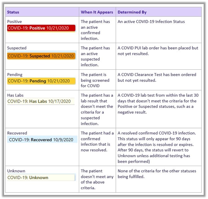 This indicator is separate from Infection status and will always display a value. Other infection statuses that you are accustomed to seeing are displayed separately. The values for COVID are color-coded and include date information, where relevant.