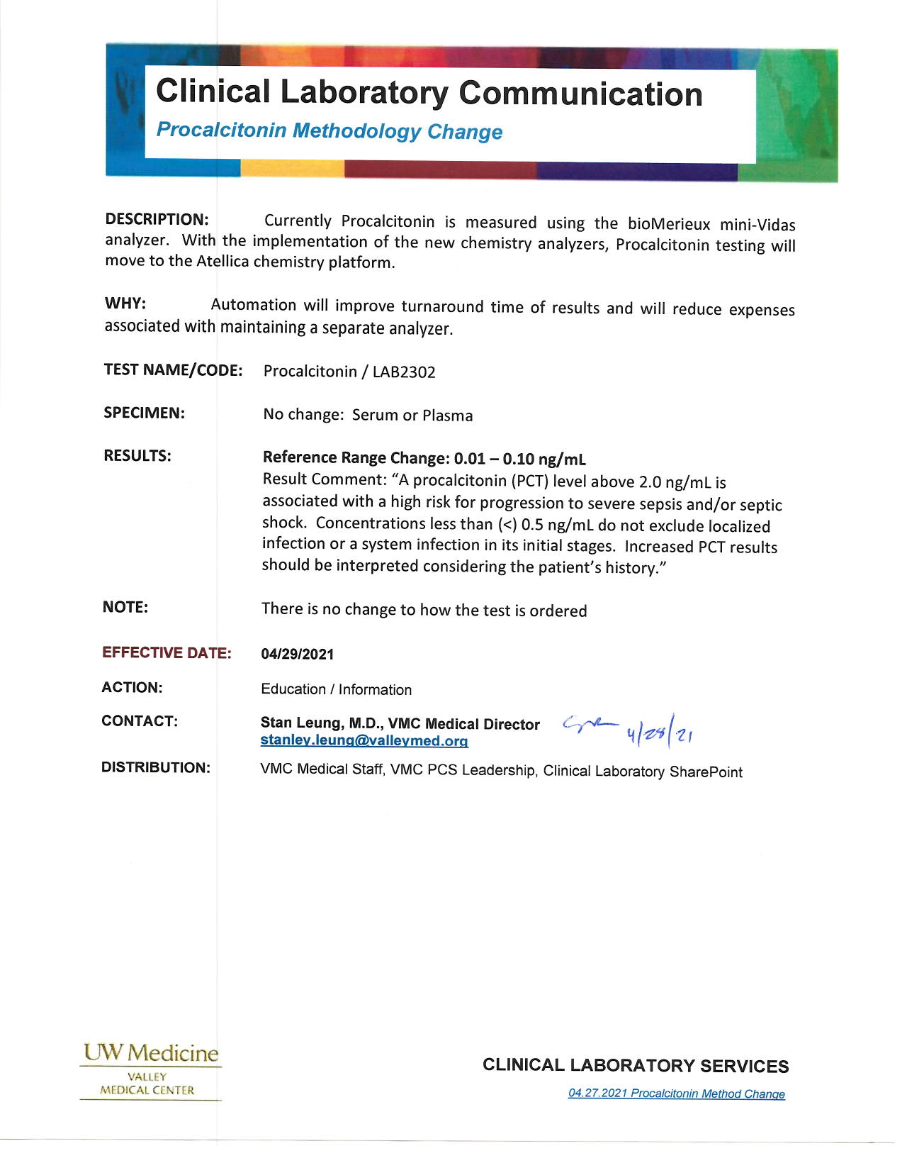 The laboratory is transitioning to a new automated method for Procalcitonin testing. This transition will occur when current test supplies are depleted. There will be no change to how orders are placed in EPIC. Please see scanned image of the communication below.