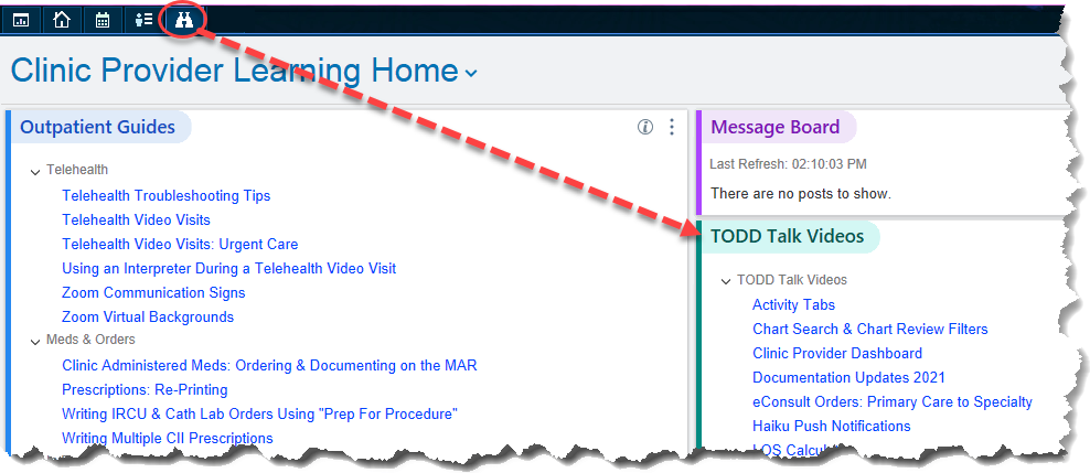 You can access all of the TODD Talk videos from the Clinic Provider Learning Dashboard in Epic: