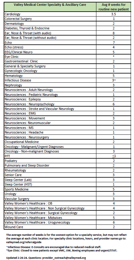 The table below displays the average number of weeks for a routine referral for a new patient appointment with a specialty clinic or ancillary service. For urgent or STAT referrals please see the individual guidelines for each specialty area in the VMC Referral Guide.