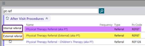 Search for ‘pt ref’ to see the internal and external PT referral orders: