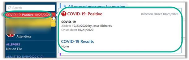 This indicator is separate from Infection status and will always display a value. Other infection statuses that you are accustomed to seeing are displayed separately. The values for COVID are color-coded and include date information, where relevant.