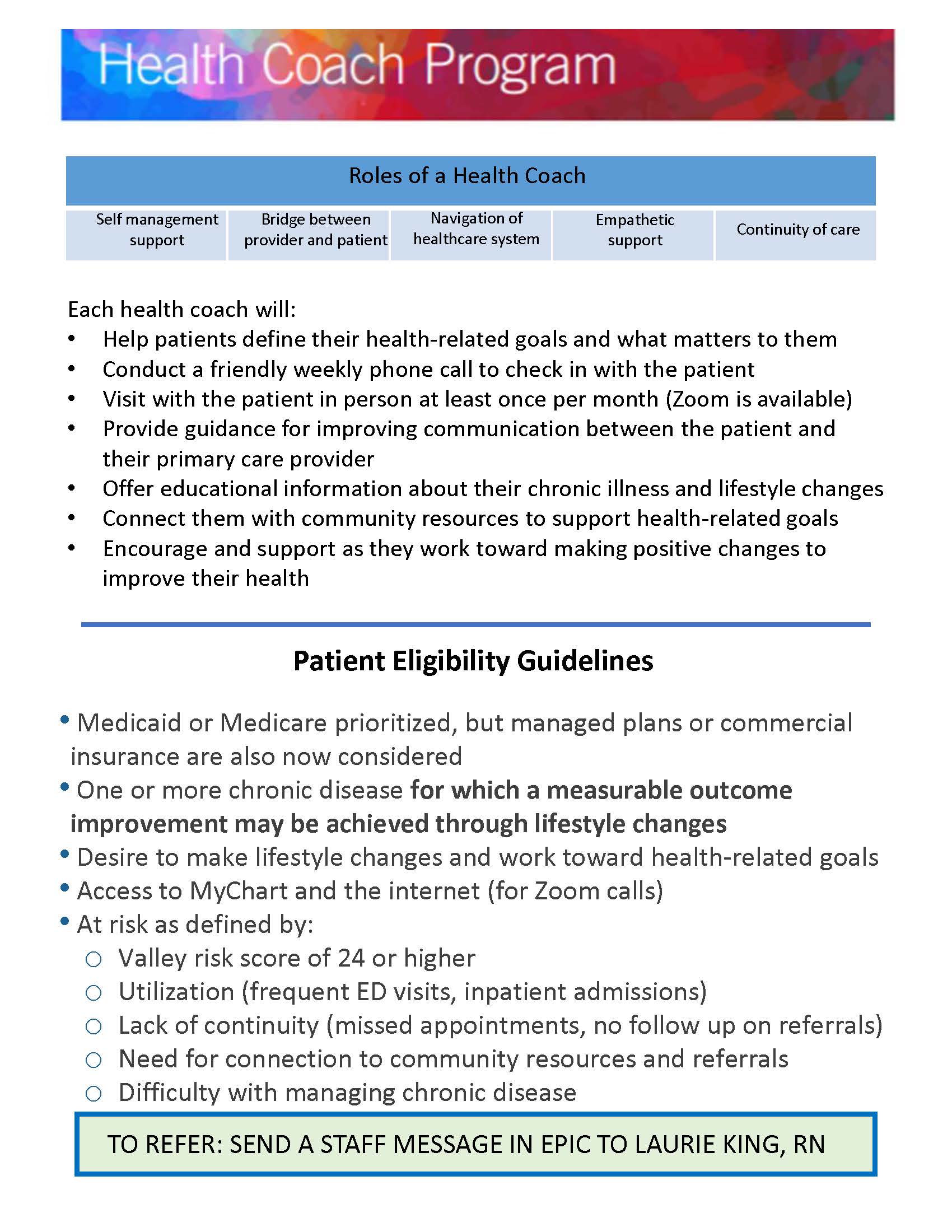Do you have patients who could benefit from the assistance of a health coach? Valley's volunteer Health Coach Program is currently accepting referrals of patients.