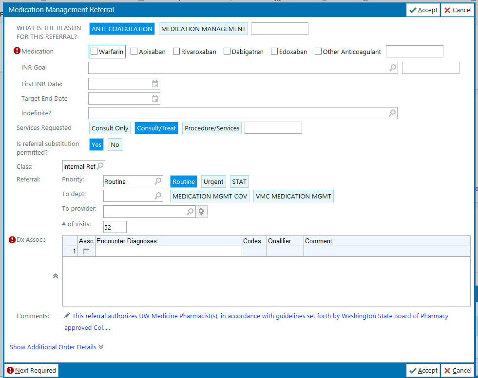 Along with the clinic name change, the current referral to the Anticoagulation Clinic will be renamed to Medication Management Referral. The new Medication Management referral will include “Anticoag” and “Anticoagulation” as synonyms when searching for referrals. A screenshot of the new referral is included below. At go-live, we will not be accepting referrals for Medication Management. Information will be sent out once ready to accept such referrals.