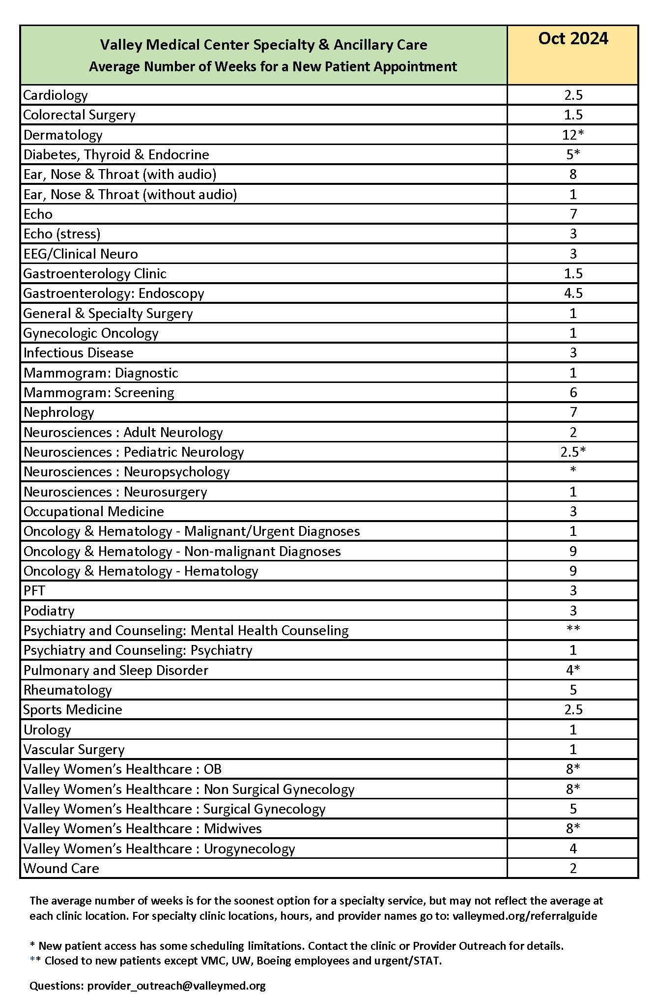 The table below displays the average number of weeks for a routine referral for a new patient appointment with a specialty clinic or ancillary service. For urgent or STAT referrals please see the individual guidelines for each specialty area in the VMC Referral Guide.