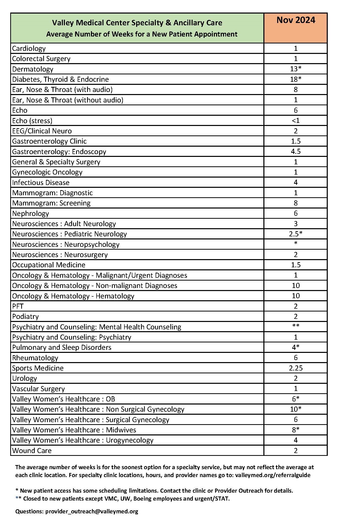 The table below displays the average number of weeks for a routine referral for a new patient appointment with a specialty clinic or ancillary service. For urgent or STAT referrals please see the individual guidelines for each specialty area in the VMC Referral Guide.