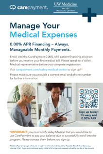 After receiving their welcome packet, they can set up their CarePayment account and learn more at https://www.carepayment.com/valley-medical-center/ or by calling 866.625.8532.