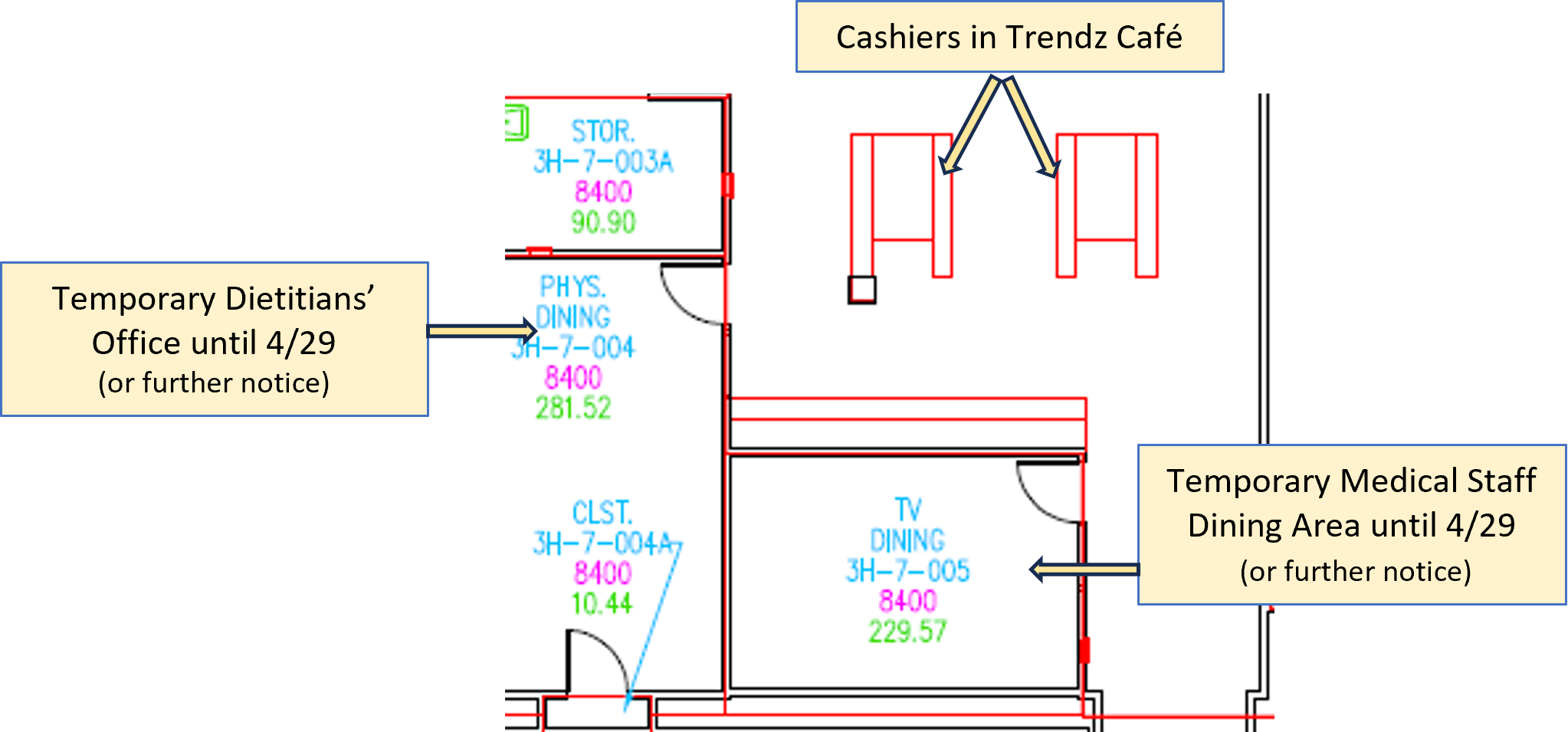 This transition will be in place until April 29 or further notice. The two computer workstations in the current medical staff area will be set up in the temporary dining area and signs will be posted on the doors.