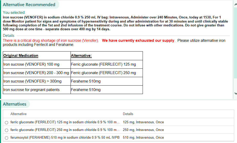 There is a nationwide, critical drug shortage for iron sucrose (Venofer) and we have nearly exhausted our supply. EPIC alerts will be added to recommend alternative IV iron products, which include Ferrlecit (ferric gluconate), Feraheme (ferumoxytol), and InFed (iron dextran). For patients needing IV iron therapy in our Infusion Center, please utilize alternative agents when obtaining prior authorization and placing orders in therapy or treatment plans.