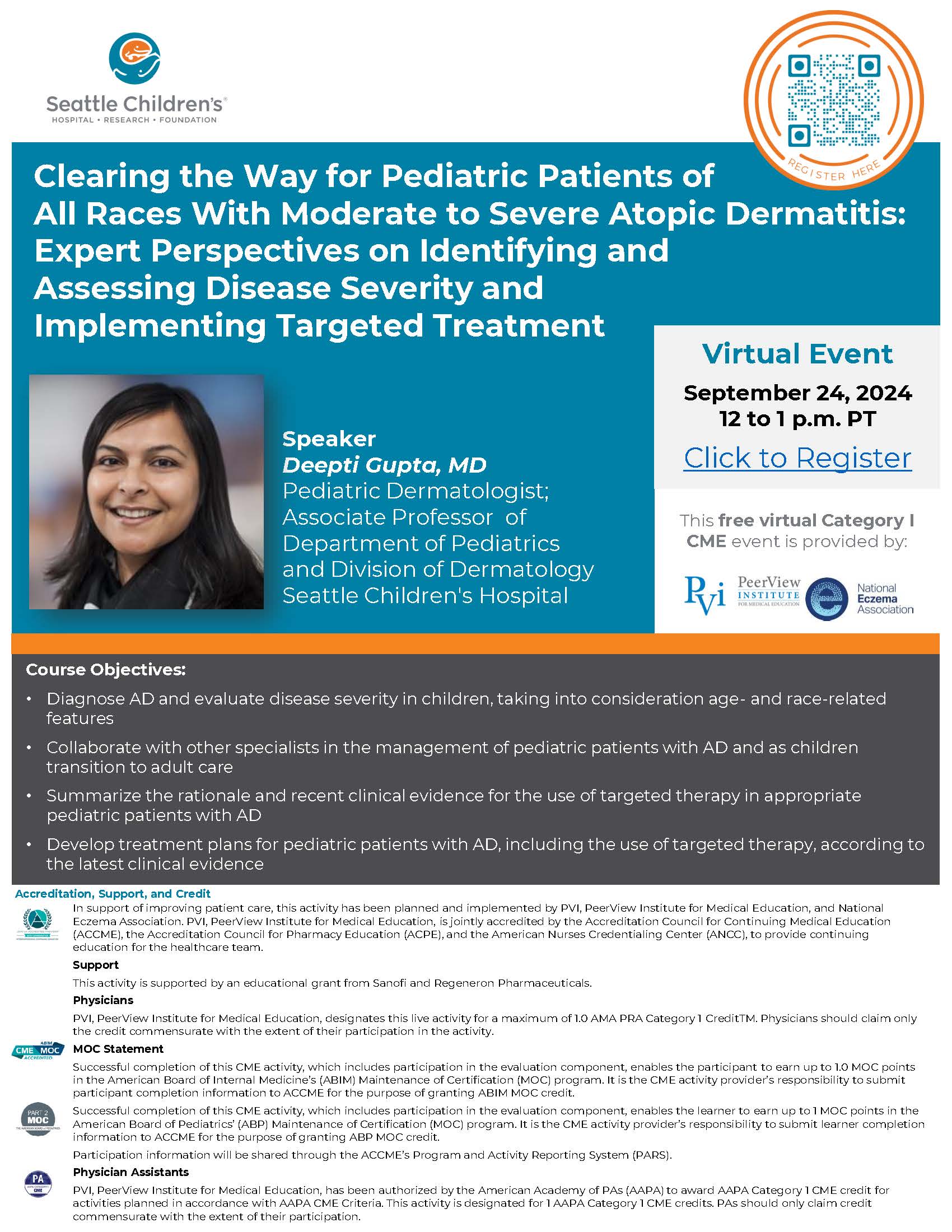 For more information or to register: Clearing the Way for Pediatric Patients of All Races with Moderate to Severe Atopic Dermatitis registration - Seattle Children's WebEx Enterprise Site.
