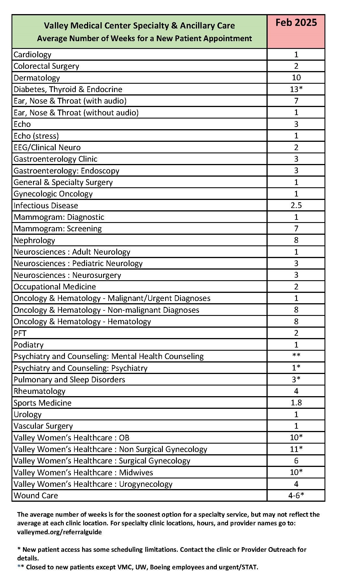 The table below displays the average number of weeks for a routine referral for a new patient appointment with a specialty clinic or ancillary service. For urgent or STAT referrals please see the individual guidelines for each specialty area in the VMC Referral Guide.