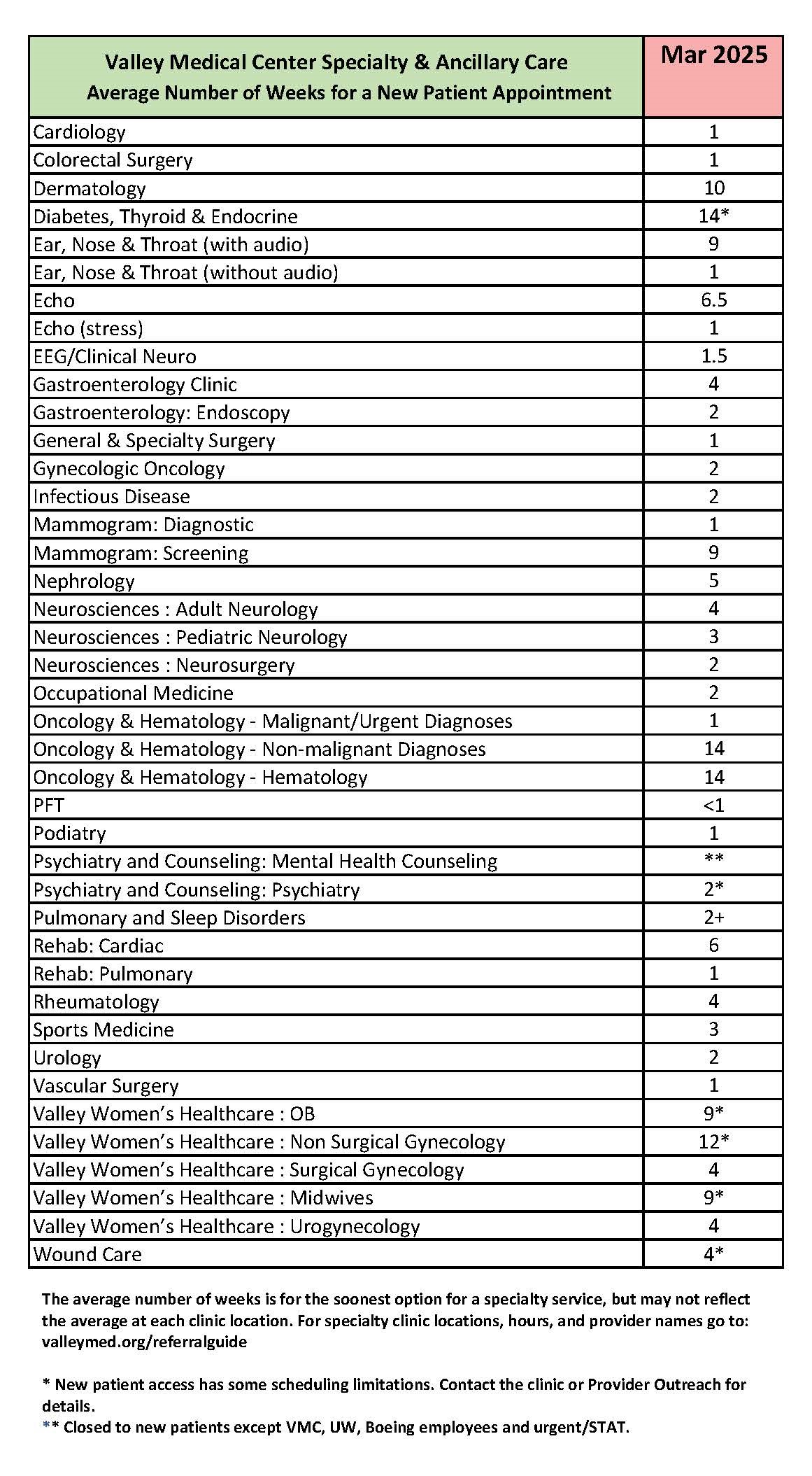 The table below displays the average number of weeks for a routine referral for a new patient appointment with a specialty clinic or ancillary service. For urgent or STAT referrals please see the individual guidelines for each specialty area in the VMC Referral Guide.